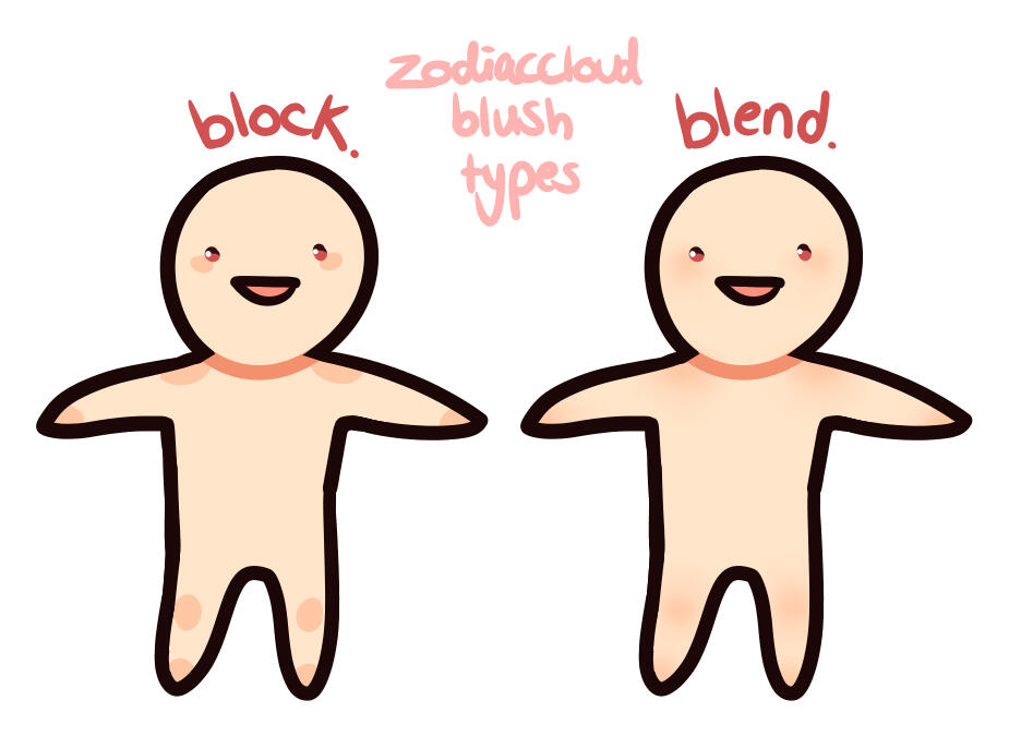 my style can vary a lot, let me know which examples are closest to what you have in mind!!!○ For non-mspaint pieces, let me know if you want block blush (solid colour blushing, looks more cartoony) or blend blush (soft, gradient blushing, more natural looking)! I can show finished piece examples of each to you if you wish! <3 but for quick reference here's a lil doodle of each aha (if preference is not stated, I'll just do whatever feels right for the piece!) :